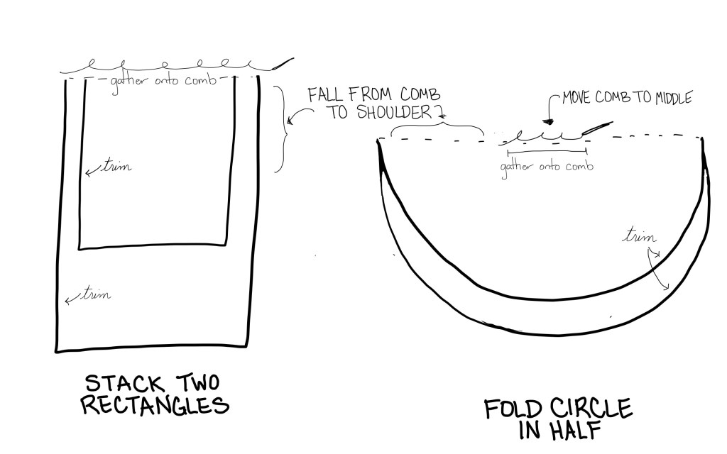 Blushers can be added to almost any veil we make using one of two general techniques: stacking two rectangles on top of each other or folding a circle in half.