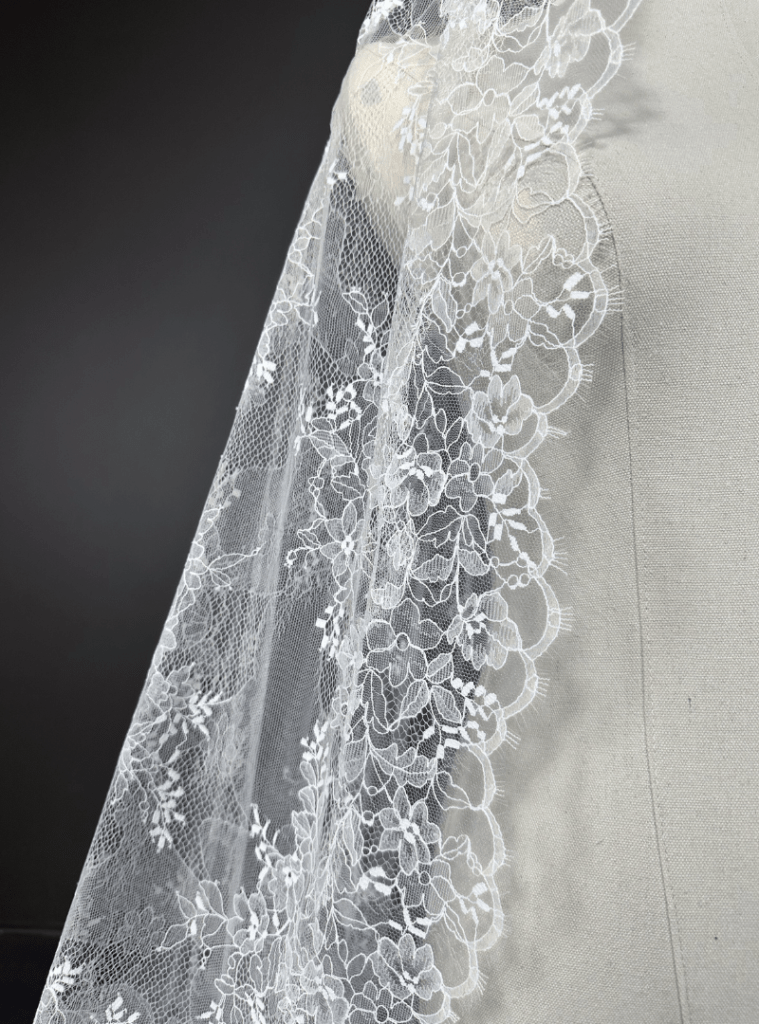 An allover lace veil – whether it’s a delicate Chantilly, a price-aware Raschel, or a bold, corded Alençon – is no longer just an add-on. It is a foundational element of the bridal look. When a bride opts for full-coverage lace, she is looking for texture, depth, and architectural interest.