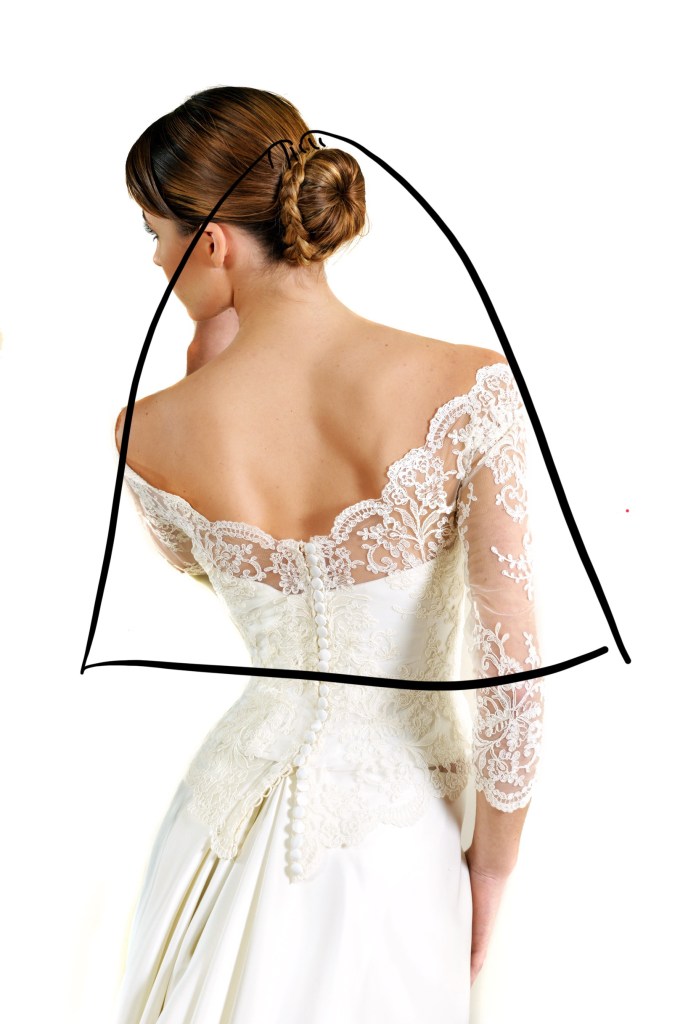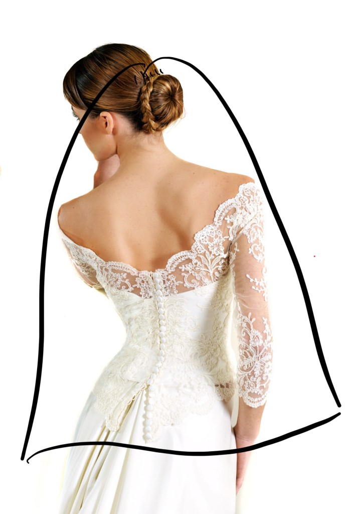 THE VEIL IS A FRAME Think of the veil edge/trim like a picture frame, and the detail on the back of the gown as the art. Try not to let the frame cut through the middle of the art. We’ve sketched a standard elbow length veil and a custom elbow-ish. Which do you think creates the best frame around the lace overlay, buttons and box pleating at the bum?