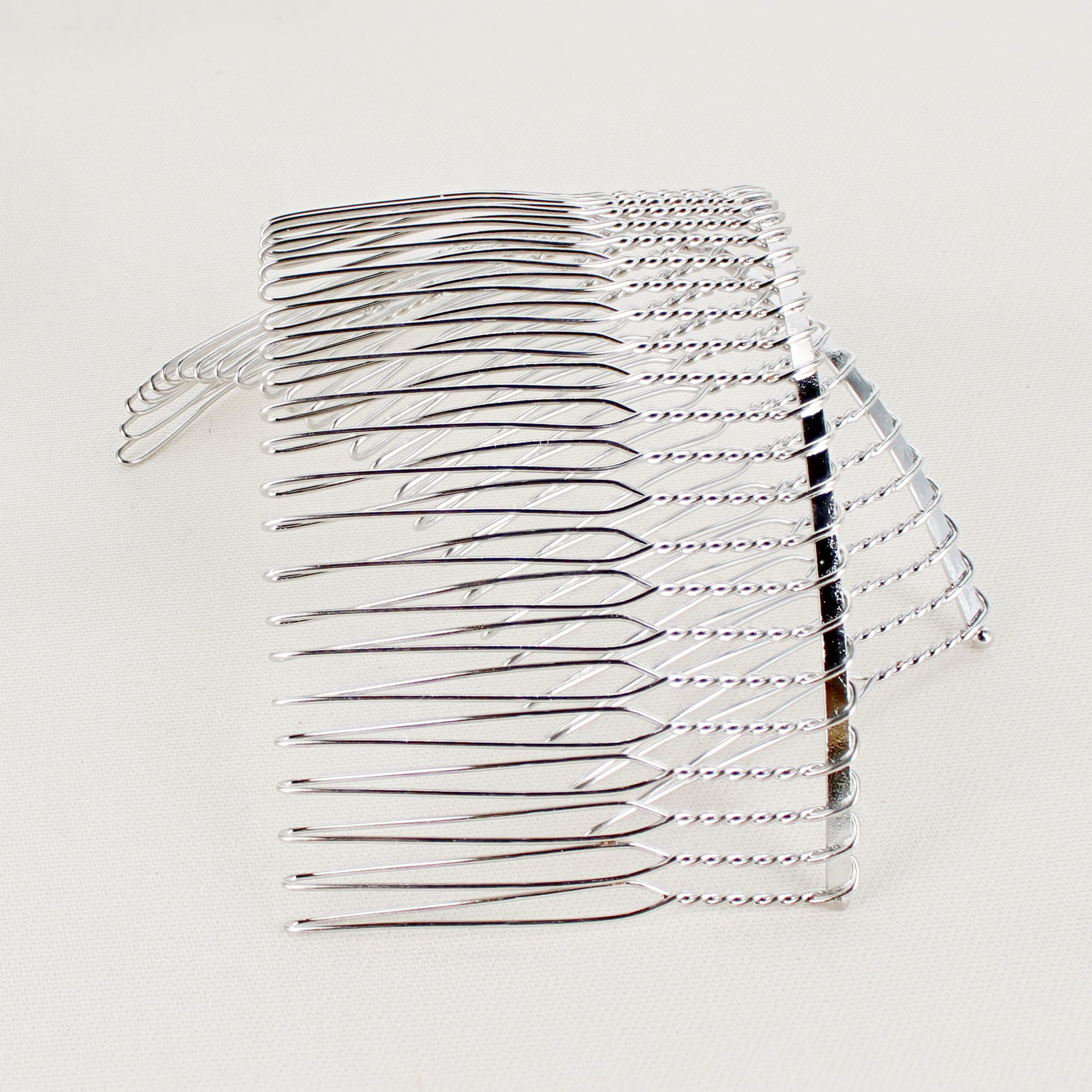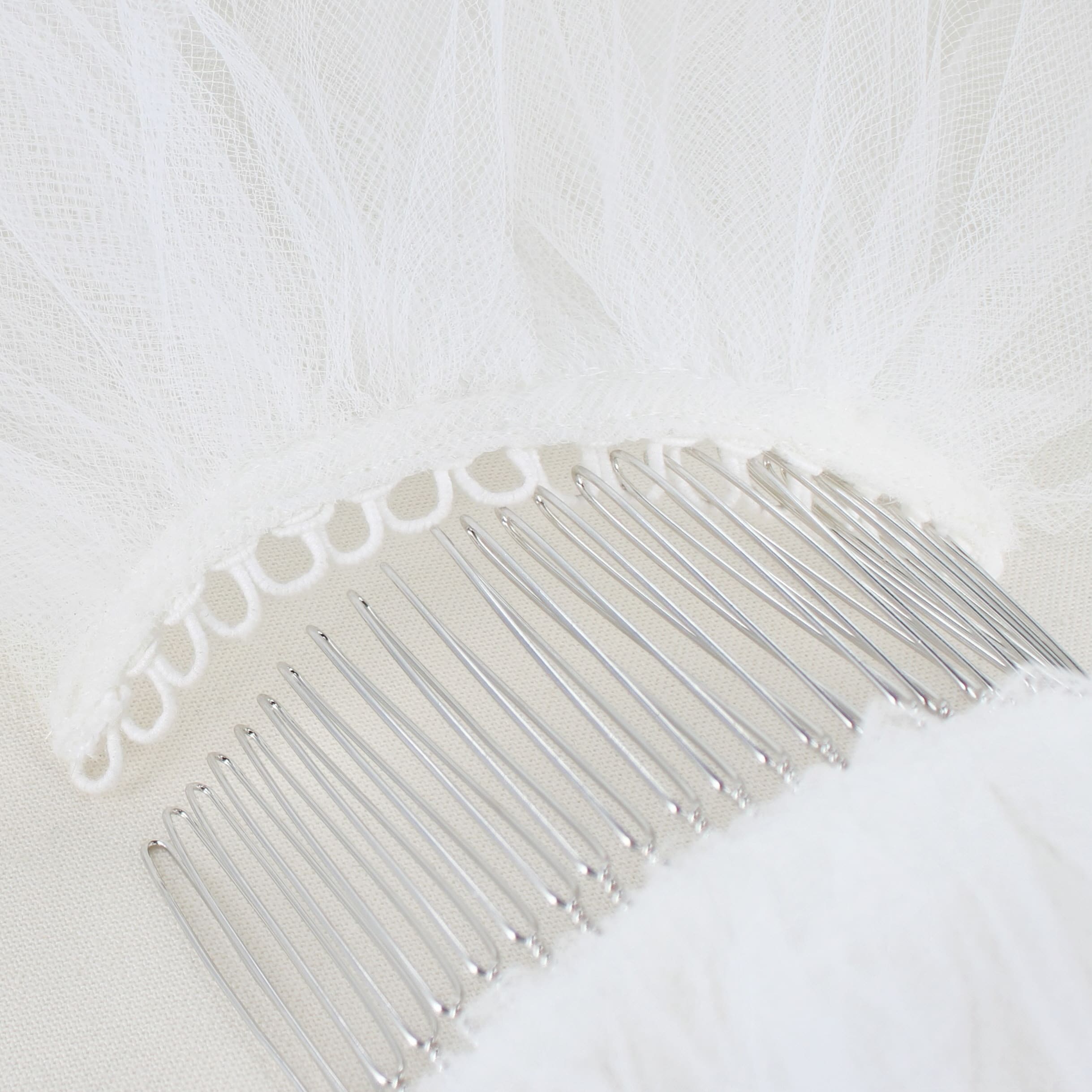 We are very particular about the metal combs we hand-stitch our veils onto. They are made to our exacting standards, and we want them to be just so: perfectly curved to fit against your brides head and with long straight teeth to secure into her hairstyle. And, if you have a bride who needs something other than a comb to attach her veil, we have options for that as well!
